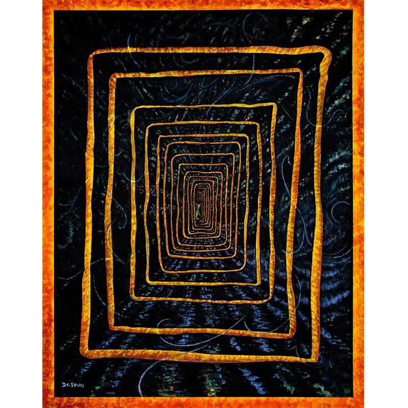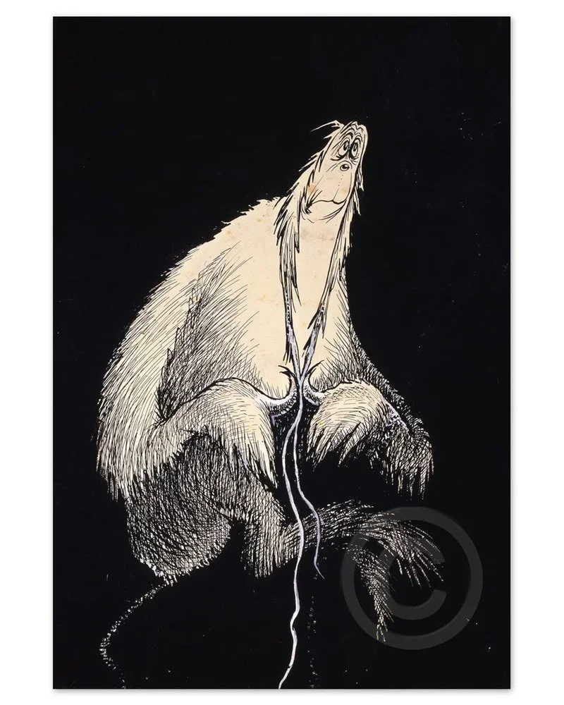After having ascended to international fame following the release of The Cat in the Hat and How The Grinch Stole Christmas, Ted commented that he worried people would “take one look and recognize me as a fraud.” That confession can be seen as defeatist, or as empowerment – depending upon how we choose to use it. Ted used it to fuel a series of private works that helped him find his way, including rare paintings such as Green Cat in Uleåborg Finland Subway and Fooling Nobody.