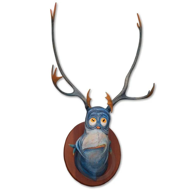 Look closely at the sculpture’s expression, the long, searching visage, the furred shoulders drawn up as if bracing for an answer that has not arrived. Ted used this very “dilemma face” decades earlier in his unorthodox taxidermy, most notably the Sea-Going Dilemma Fish, as it distilled the feeling of being caught between possibilities – the Dilemma Fish has both fins and horns, a dilemma incarnate. Here, in his self-portrait, he turns that vocabulary on himself with disarming honesty.