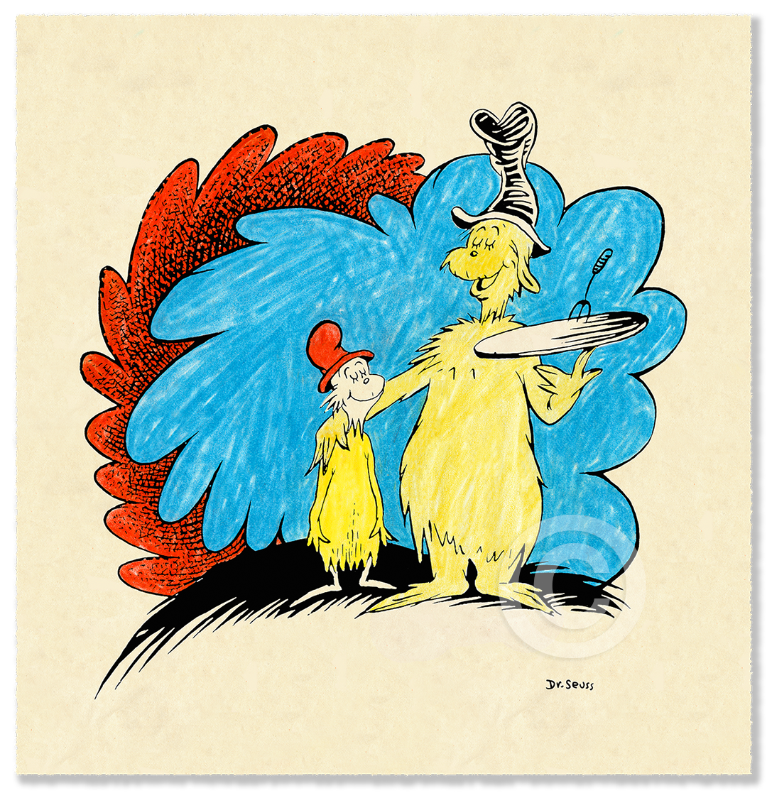 Adapted posthumously from the illustration on the last page of the 1960 book, Green Eggs and Ham, this iconic 60th Anniversary image seems to mark the culmination of Dr. Seuss’s determination, open-mindedness, and willingness to meet challenges head-on.