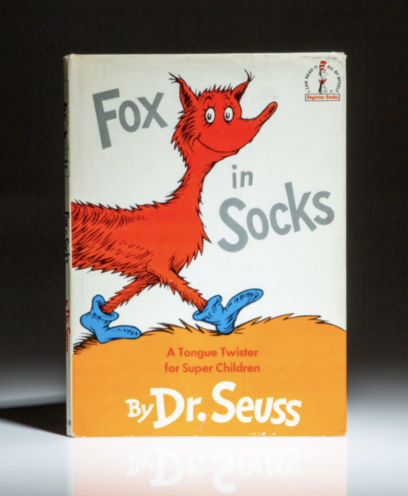 The Fox in Socks cover is a masterclass in visual storytelling, with Dr. Seuss using composition to create instant tension and intrigue.