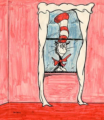 Dr. Seuss understood that centering the character would drain the image of energy; instead, this off-balance approach invites us to lean in, to open the book and meet this odd intruder head-on.
