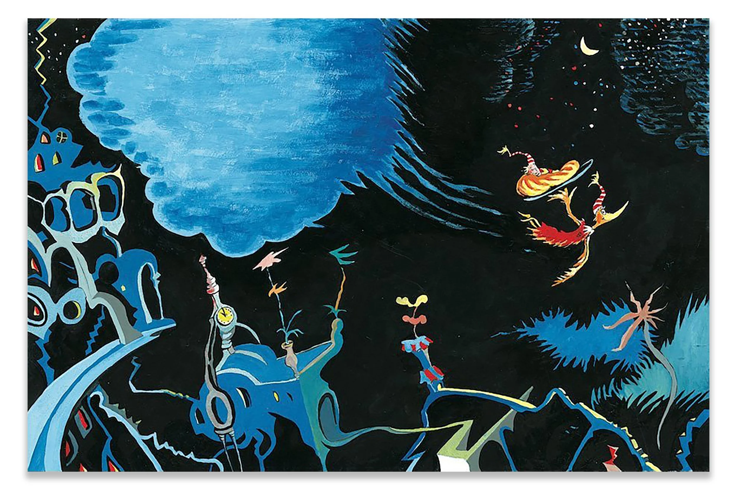Upon close examination, one notices the unfinished nature of the canvas in select areas. Ted leaves sketchy pencil lines and unfinished ideas along the way. It’s unclear if he never completed the painting, or if he understood that by leaving a trace of his process we could “see” the creative journey along with its many twists and turns. Either way, Ted allows us an unfiltered glimpse into the mind of Dr. Seuss. This ability to go “behind-the-scenes” and discover a deeper understanding of this American icon is what makes the Art of Dr. Seuss collection such an historic body of work.