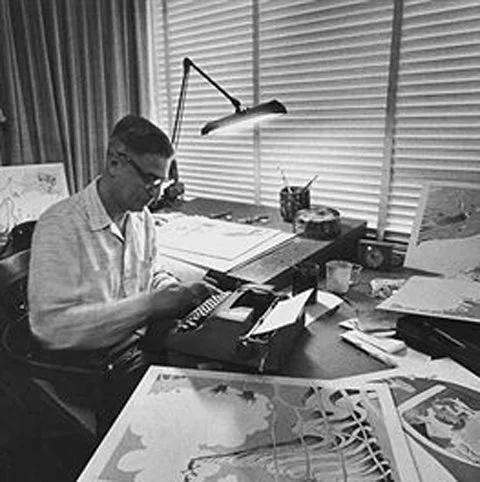 Ted Geisel, aka Dr. Seuss, at work on the paintings and text for Happy Birthday to You! (circa 1958)